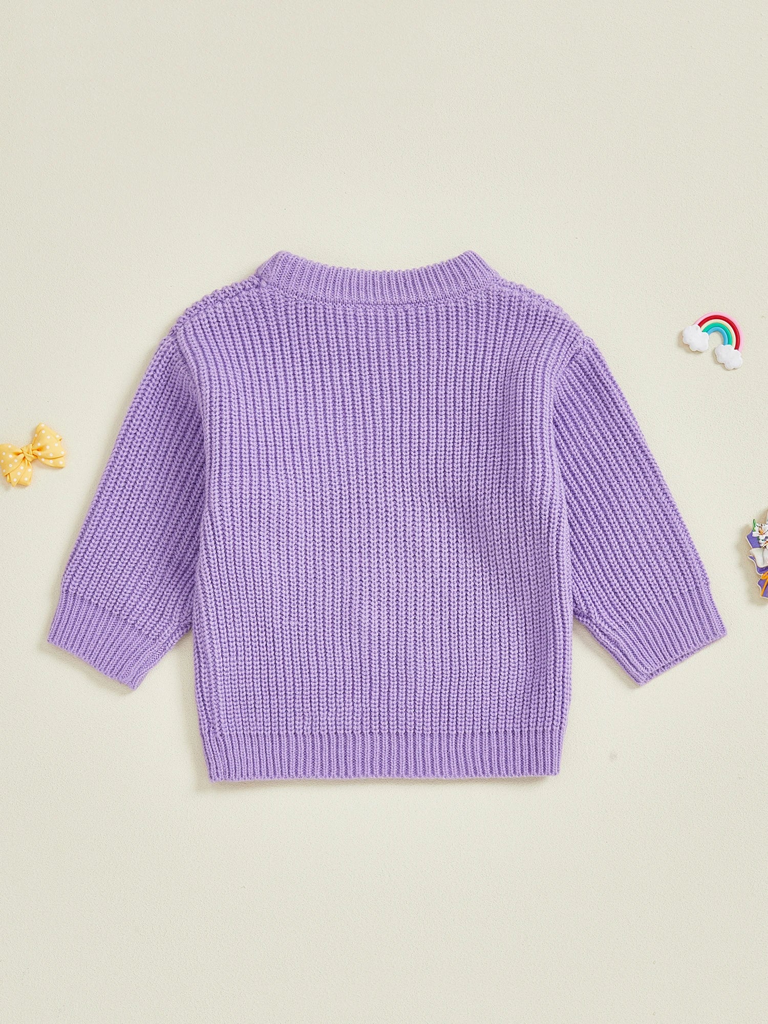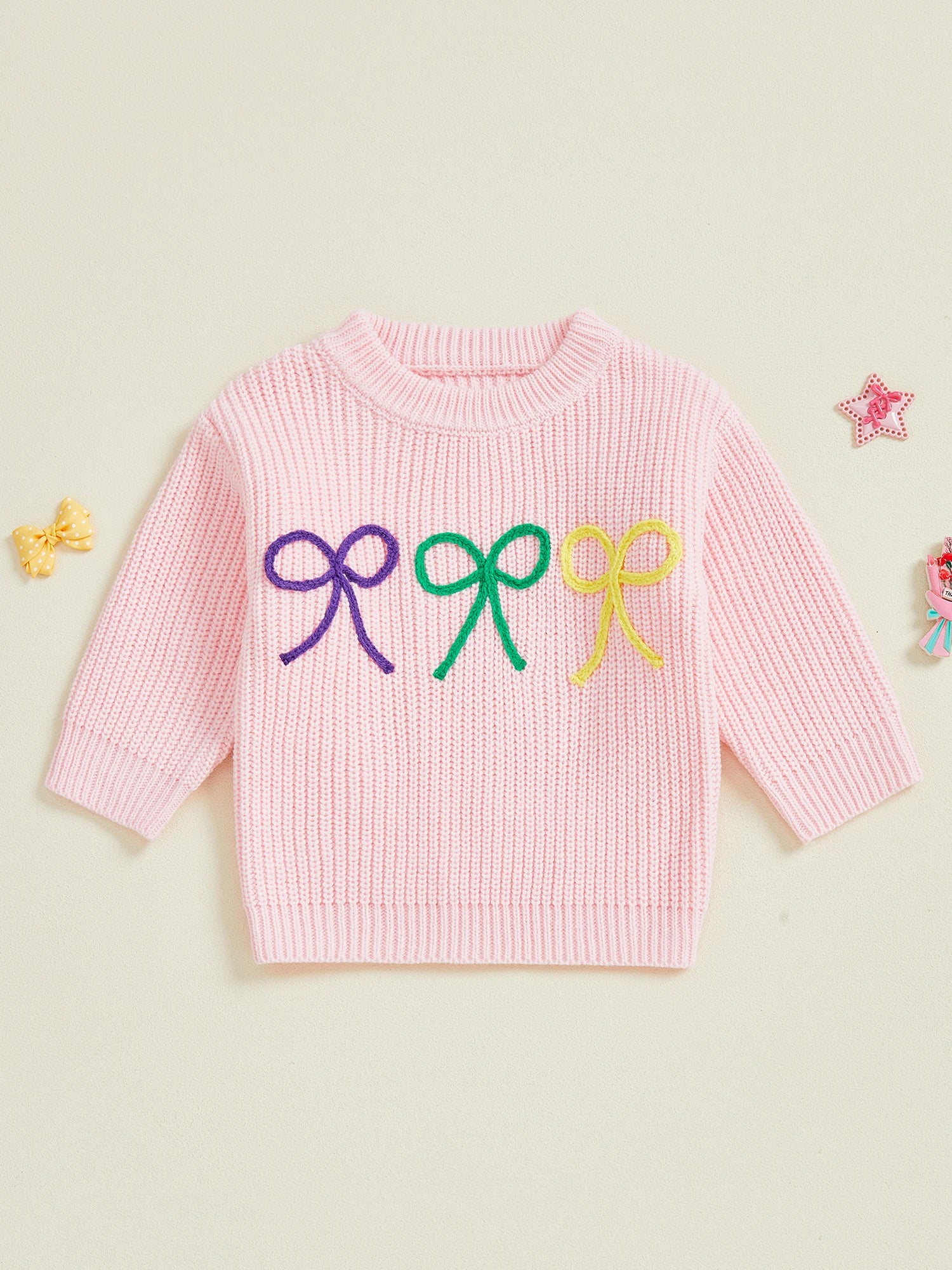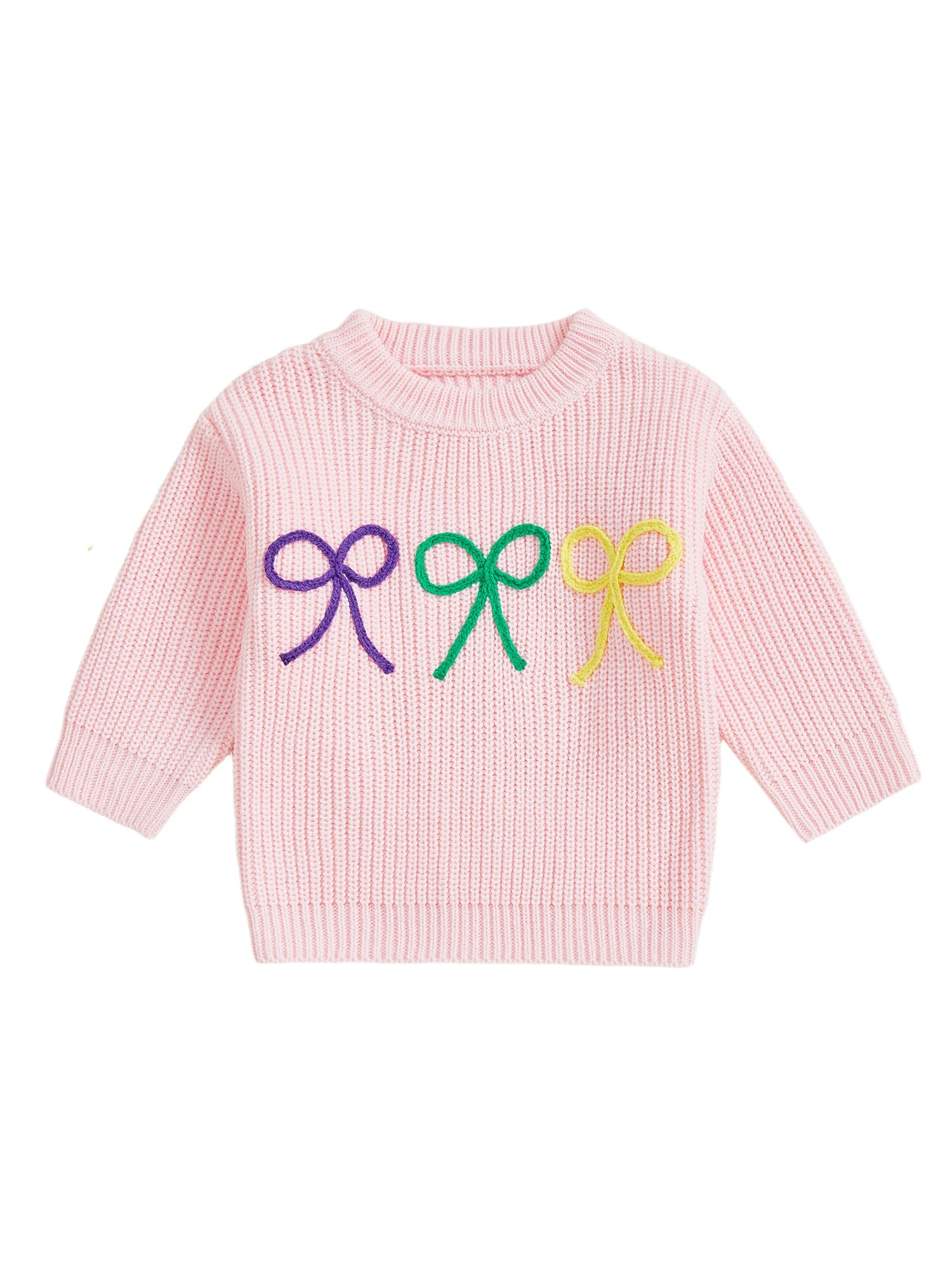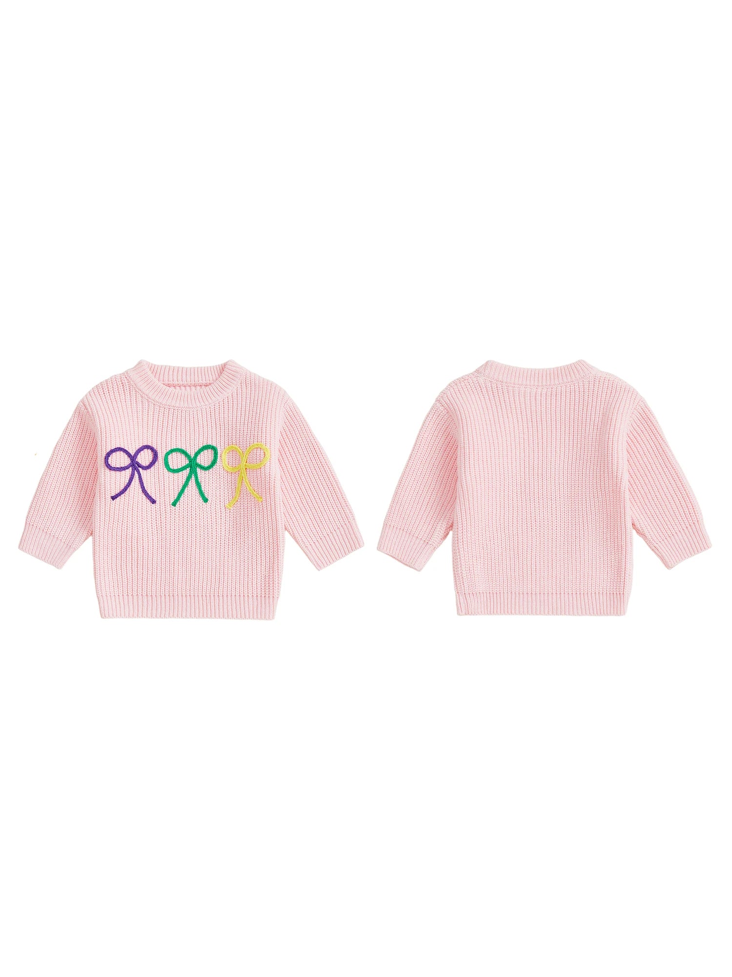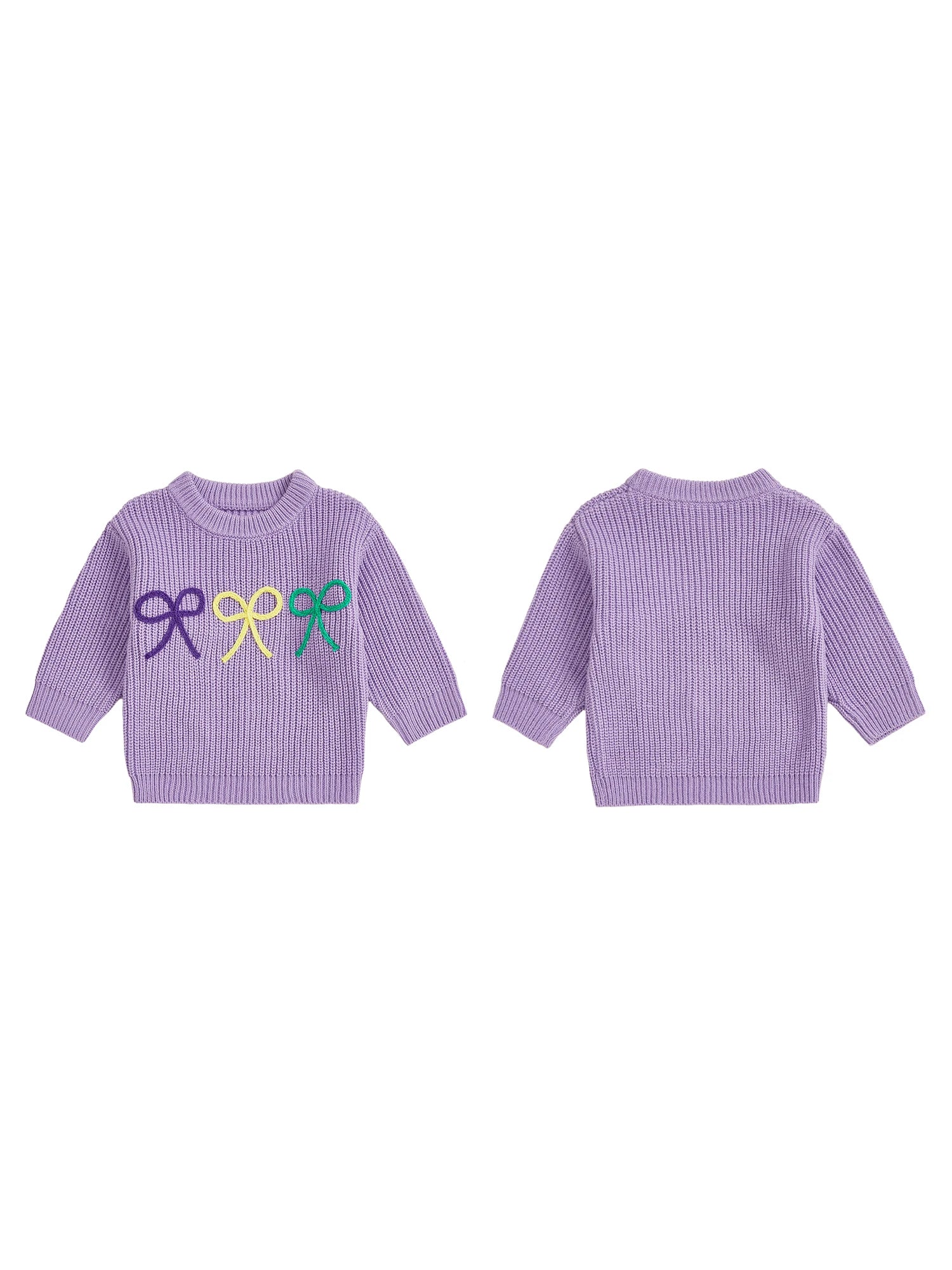 Mardi Gras Toddler Girl Sweater with Embroidered Bow Detail Crew Neck Long Sleeves and Chunky Knit Design for Cozy Style